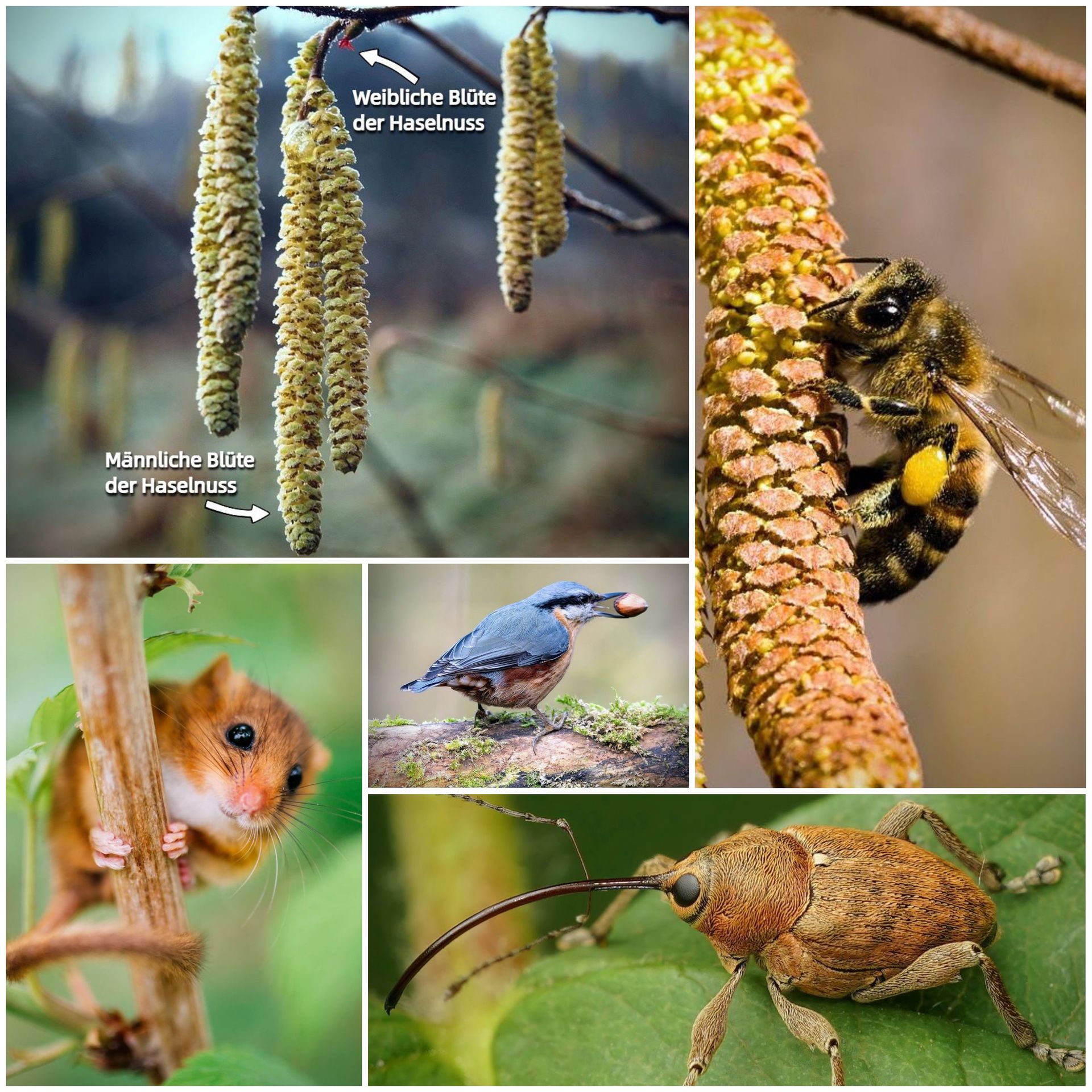 Der Haselstrauch ist nicht nur ein wichtiger Nistplatz für viele Vogelarten, sondern bietet auch reichlich Nahrung für Säugetiere. Die Haselnüsse sind mit ihrem 60-prozentigen Fettgehalt eine wichtige Nahrungsquelle für Haselmaus, Rötelmaus und Spitzmaus, für das Eichhörnchen und auch für das Wildschwein, das den Boden unter dem Haselnussstrauch nach Nüssen absucht.