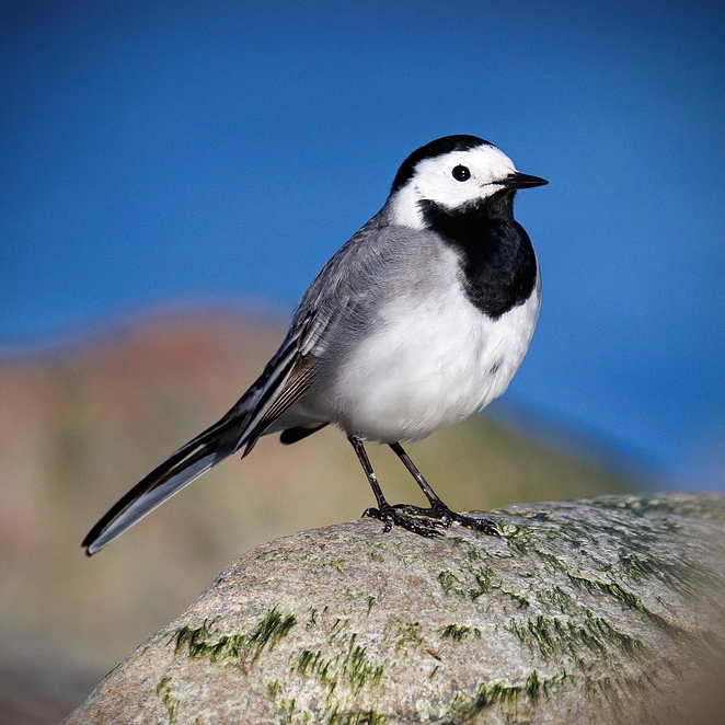 Charakteristische Merkmale/Aussehen: Bauch und Flügelspitzen sind weiß, der Rücken und die Flügel sind grau/schwarz/weiß. Die Kappe, der Kehlfleck, Nacken und der der lange Schwanz sind schwarz. Weiße Flügelbinde. Schneller Schritt am Boden, ständiges Wippen mit dem Schwanz.