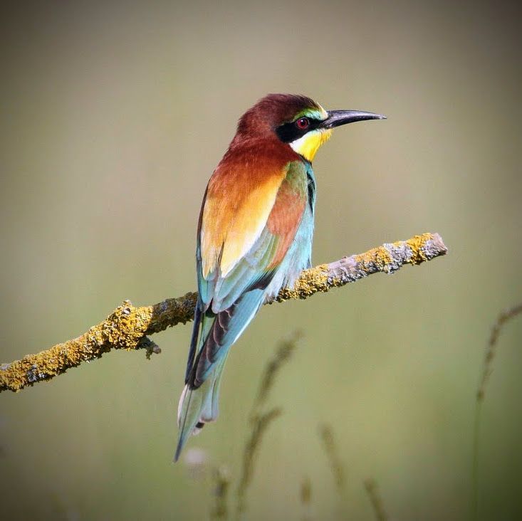 Charakteristische Merkmale/Aussehen: Sein buntes Gefieder macht ihn unverwechselbar; leuchtend gelbes Gesicht, weiße Stirn, schwarzer Augenstreif, türkisfarbener Bauch, blauer Schwanz, rotbraune Färbung von Scheitel, Mantel, Rücken und Flanke. Er hat einen dünnen, leicht gebogenen Schnabel und ein typisches Flugbild. Die Flügel laufen spitz zu den Handschwingen.