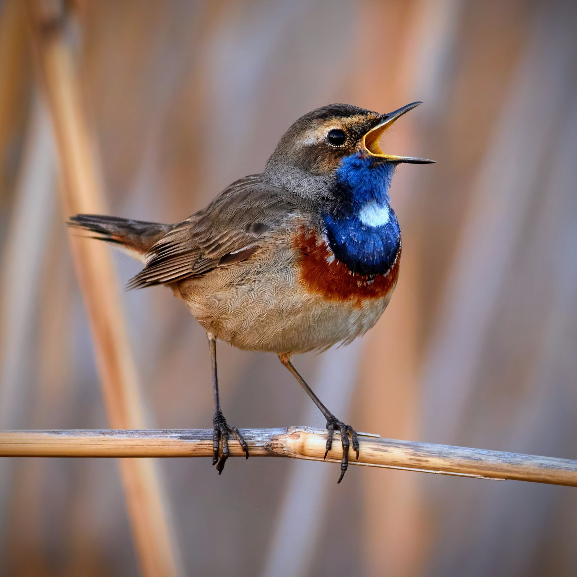 Weibchen: Kehle hell mit dunklem Saum, kein Blau. Insgesamt schlichter gefärbt.